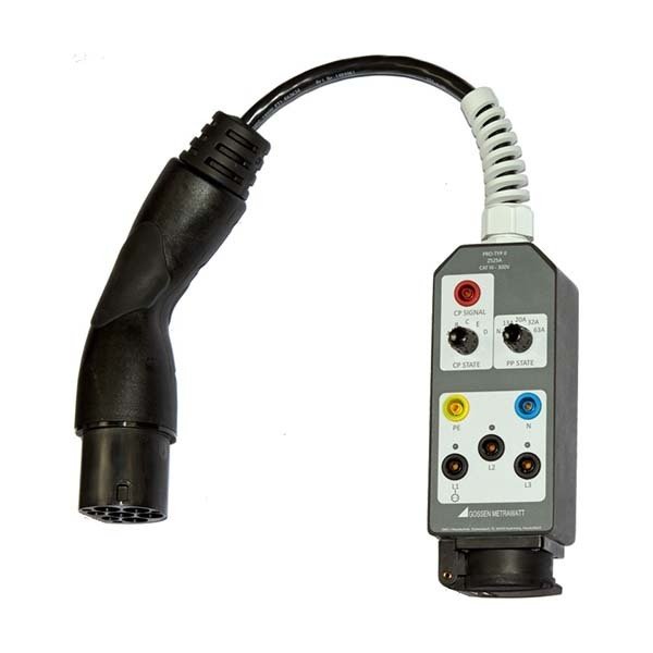 单相和三相测试适配器,带有类型2插头,用于使用Profitest Master测试电动充电站的保护措施的有效性,模拟虚构连接的电动汽车和根据IEC 61851-1标准的电缆集的电流承载能力。